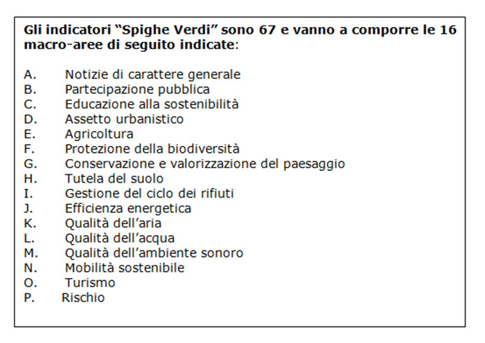 Alcuni indicatori presi in considerazione sono stati: la partecipazione pubblica; l’educazione allo sviluppo sostenibile; il corretto uso del suolo; la presenza di produzioni agricole tipiche, la sostenibilità e l’innovazione in agricoltura; la qualità dell’offerta turistica; l’esistenza e il grado di funzionalità degli impianti di depurazione; la gestione dei rifiuti con particolare riguardo alla raccolta differenziata; la valorizzazione delle aree naturalistiche eventualmente presenti sul territorio e del paesaggio; la cura dell’arredo urbano; l’accessibilità per tutti senza limitazioni. Questi sono solo alcuni degli indicatori che guidano il programma e che saranno suscettibili di variazioni, in un’ottica di miglioramento continuo e di massimo coinvolgimento dei Comuni italiani.