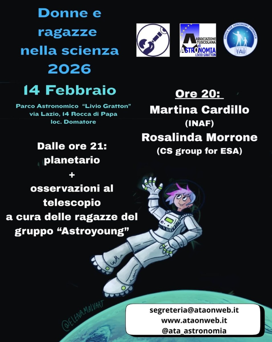 “Astroincontro” a Rocca di Papa per la Giornata internazionale delle ragazze e delle donne nella scienza. Sabato 14 febbraio alle 20.00, al Parco astronomico “Livio Gratton”, ci sarà un nuovo evento divulgativo dell’Associazione Tuscolana di Astronomia. Protagoniste saranno due brillanti ricercatrici: Martina Cardillo dell’Istituto Nazionale di Astrofisica e Rosalinda Morrone dell’Agenzia Spaziale Europea.