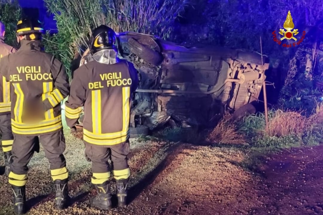 Auto fuori strada in via Maina, a Sezze: i vigili del fuoco estraggono un uomo dalle lamiere.