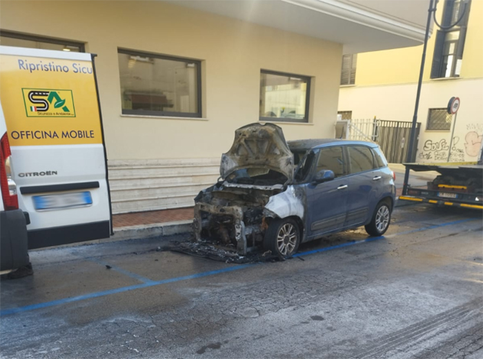 Auto in fiamme in pieno giorno nel centro di Aprilia: distrutta una Fiat 500 parcheggiata in via Carboni.