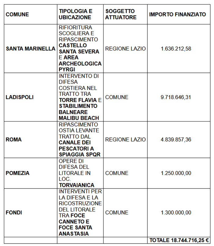 A tal fine è stata stipulata una convenzione con l’Università degli studi di Roma Sapienza. Sono stati individuati alcuni giacimenti di sabbia, ubicati in tre diversi siti a largo della costa di: