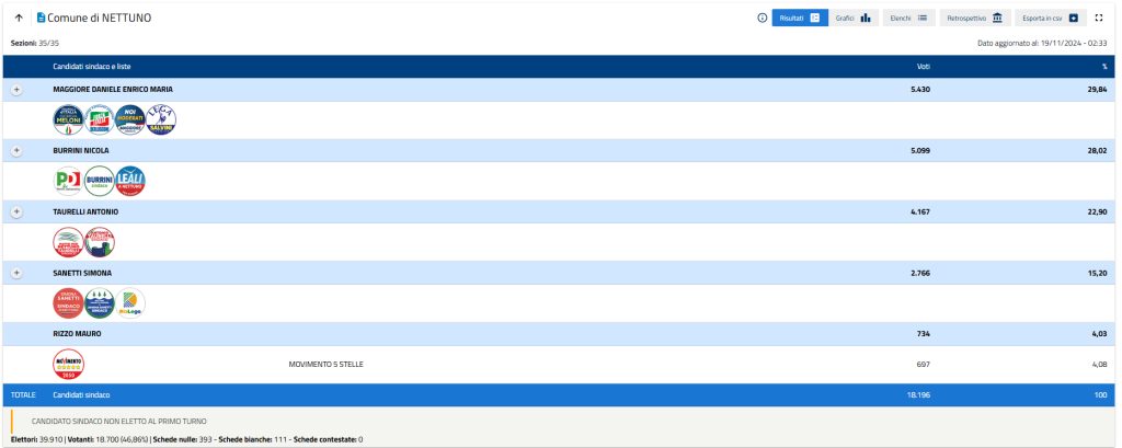A Nettuno (sciolto due volte per mafia) fino all’ultimo c’è stato un testa a testa tra il candidato sindaco Daniele Maggiore, sostenuto dal centrodestra unito con Fratelli d’Italia, Forza Italia, Lega e Noi Moderati (29%), e Nicola Burrini, candidato sindaco del centrosinistra con Partito democratico e due liste civiche (28%). Si sfideranno al ballottaggio dell’1 e 2 dicembre.