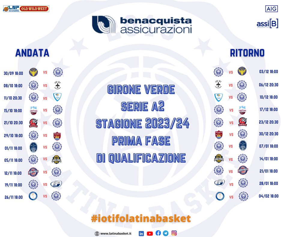 Basket maschile serie A2: la Lega Nazionale Pallacanestro ha ufficializzato i calendari. Il Latina Basket – inserito nel Girone Verde - esordirà domenica 1° Ottobre in casa del Torino. La prima giornata della regular season andrà in scena sul parquet del “Pala Gianni Asti”. I nerazzurri ancher quest’anno saranno guidati da Coach Di Manno.
