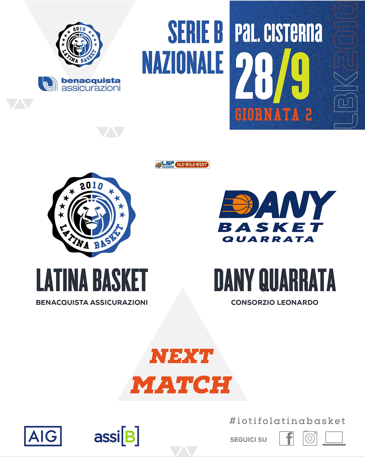 Basket B Nazionale: al Palasport di viale delle Province, a Cisterna, il Latina - dopo la bella vittoria all’esordio, in trasferta contro Fabriano - attende in casa il Dany Quarrata. Si gioca questa d...