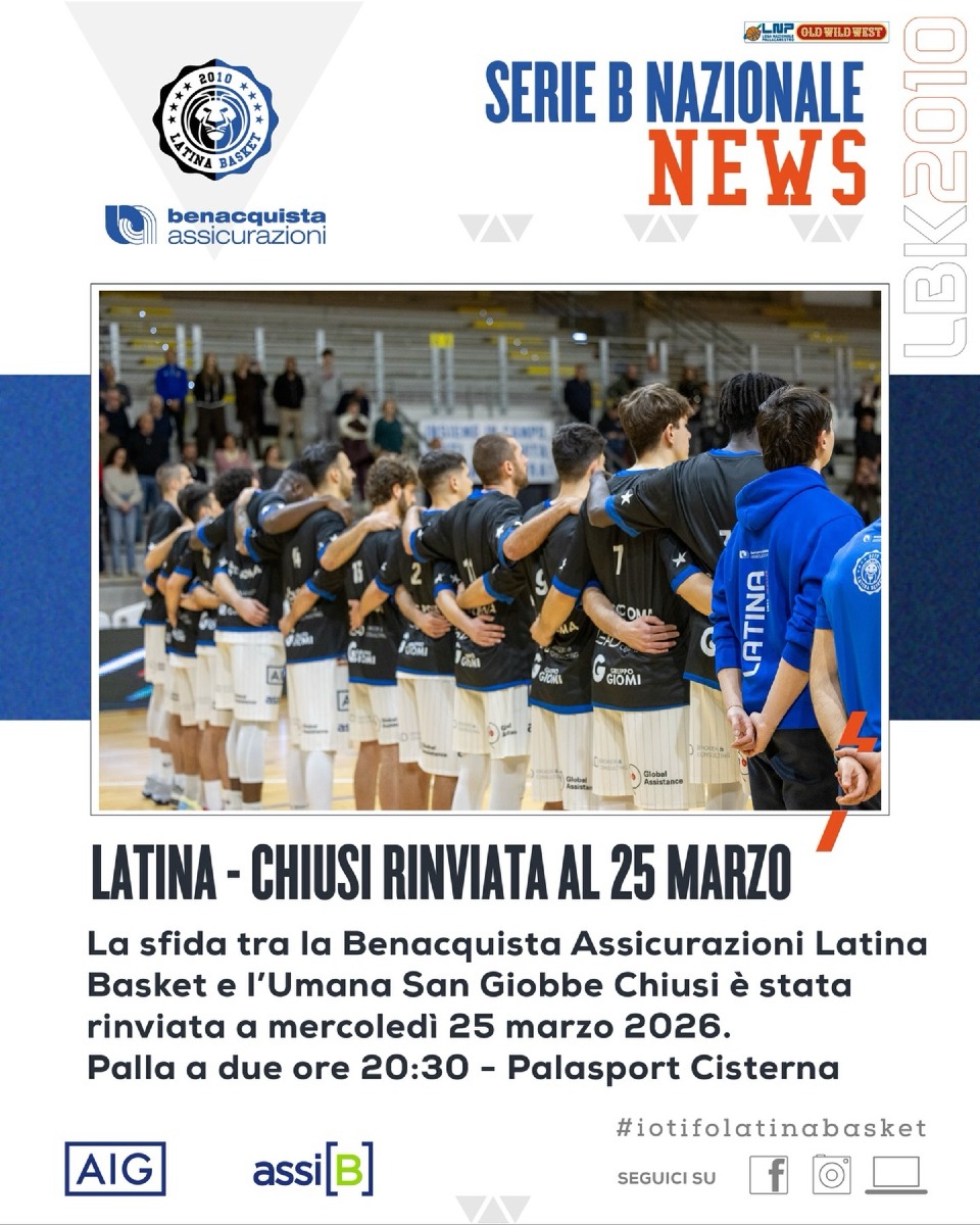 Basket B Nazionale: è stato fissato a mercoledì 25 marzo, alle 20.30, il recupero della gara del Latina contro l’Umana San Giobbe Chiusi, valida per la 23esima giornata del Campionato. Si giocherà al Palasport di Cisterna. La partita si sarebbe dovuta disputare lo scorso 25 gennaio, al Palazzetto dello Sport di Ferentino, ma era stata annullata per l’impraticabilità del campo.