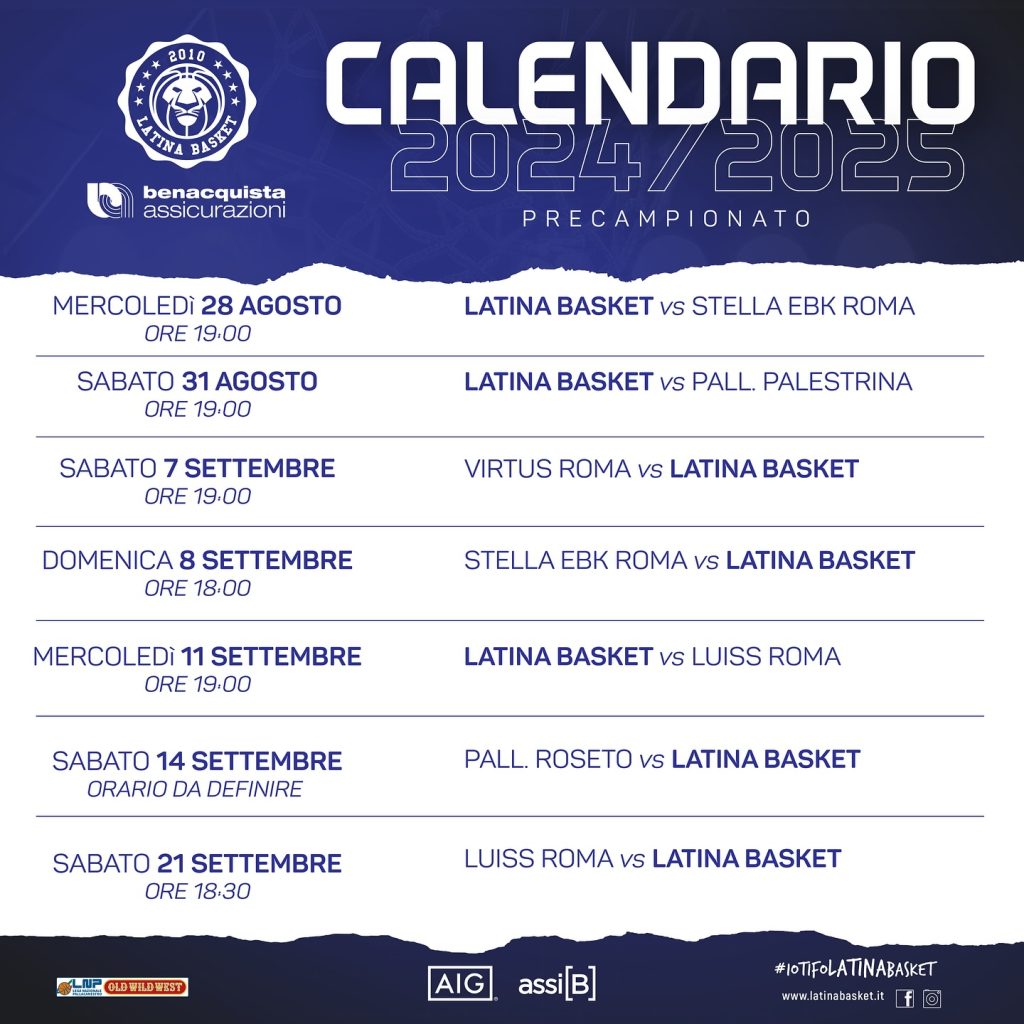 La formazione pontina, dopo i primi dieci giorni di allenamenti, disputerà già a fine agosto le prime amichevoli: mercoledì 28, infatti, ospite della Benacquista Assicurazioni sarà la StellaEBK Roma, squadra guidata da Alessandro Finelli che parteciperà al campionato di Serie B Interregionale. A chiudere il caldo mese estivo sarà invece lo scrimmage casalingo di sabato 31 agosto con la Pallacanestro Palestrina, anch’essa prossima protagonista della Division F Conference Centro della Serie B Interregionale.