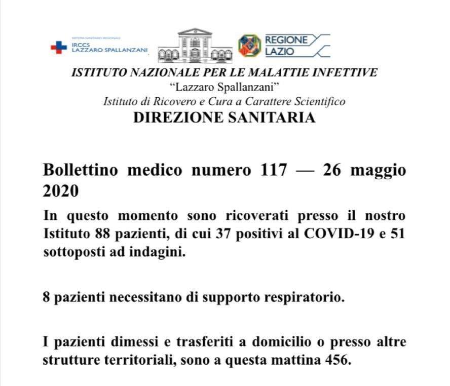 Bollettino medico dello Spallanzani: 88 ricoverati; 37 i pazienti positivi, 51 sottoposti ad indagine.