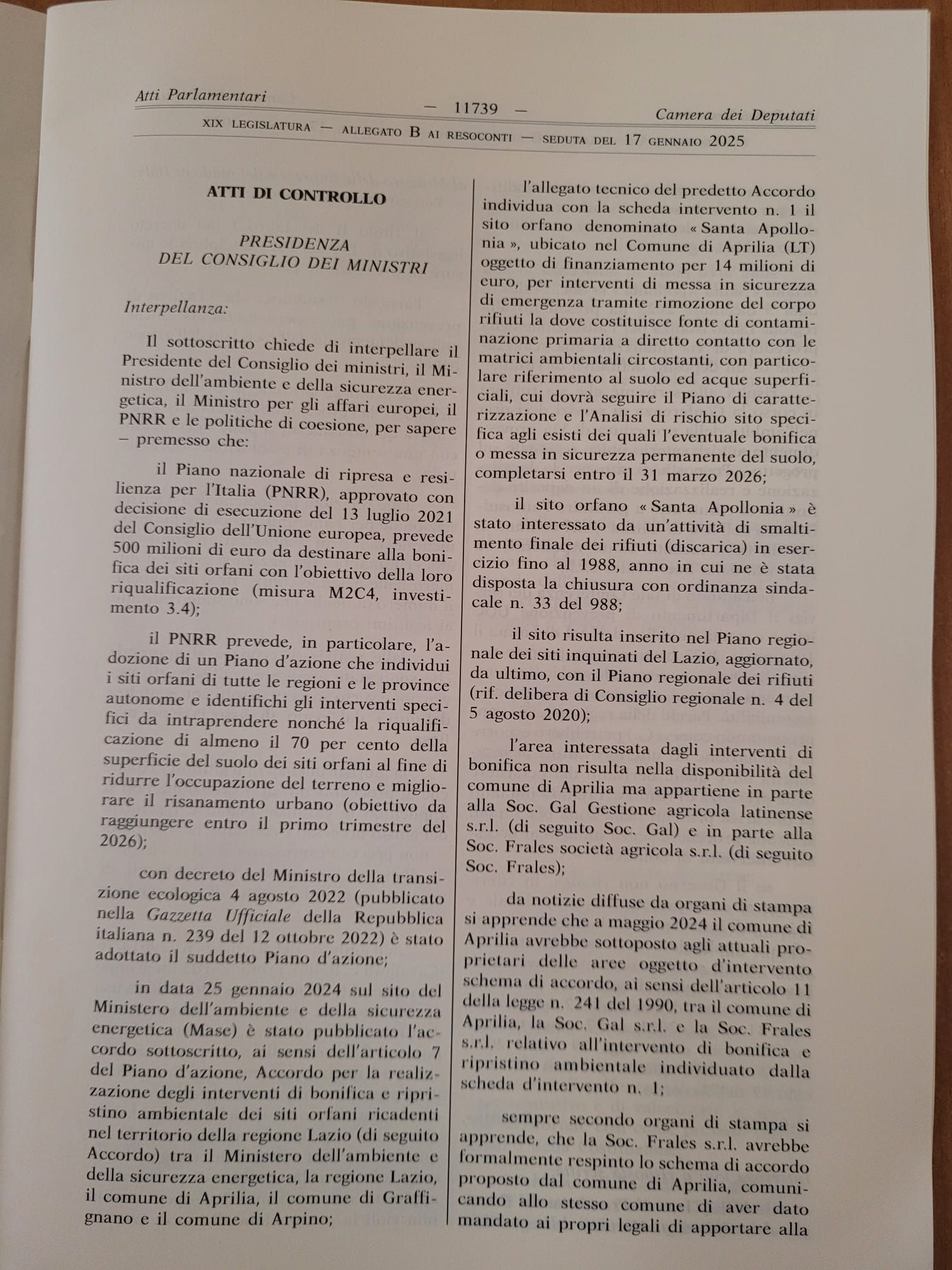 Bonifica dell'ex discarica a Sant’Apollonia, ad Aprilia. Presentata un’interrogazione parlamentare. Europa Verde: “Si rischiano di perdere 14 milioni di euro”.