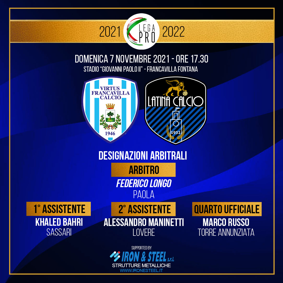 Arbitra Federico Longo di Paola; assistente Khaled Bahri di Sassari; assistente Alessandro Maninetti di Lovere;