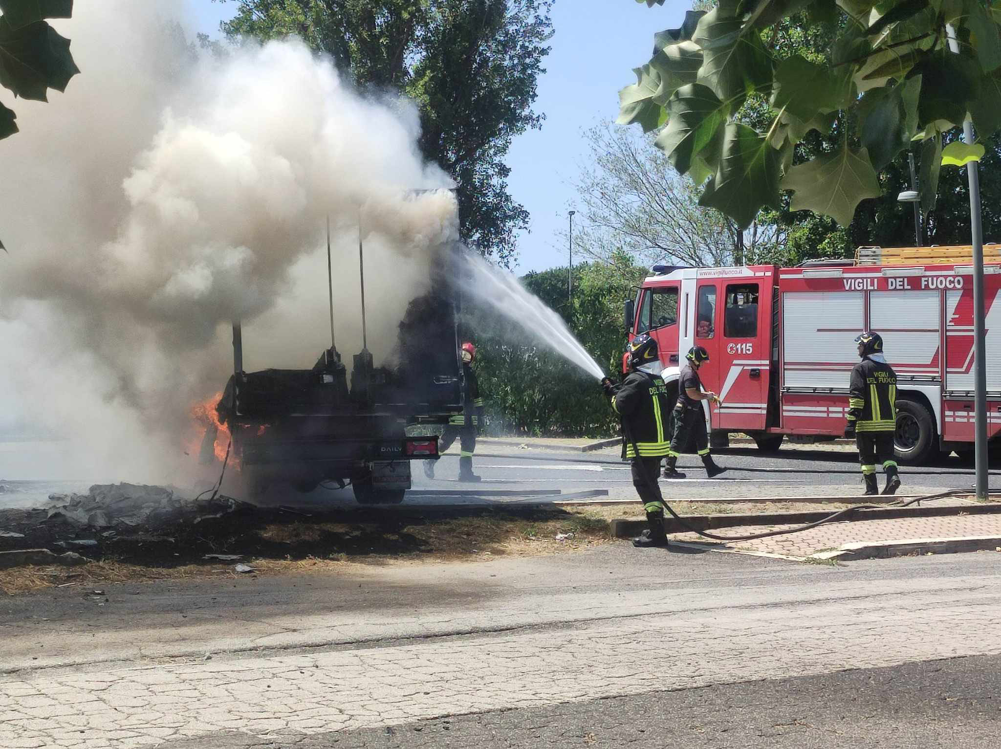 Camion in fiamme in via Mozart, ad Aprilia, alle spalle del Mc Donald’s. Intervento lampo dei vigili del fuoco. VIDEO -