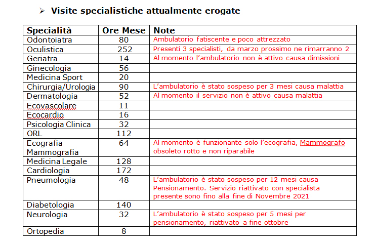 - Inefficace attività amministrativa di programmazione per le sostituzioni e o avvicendamento degli specialisti, scarsità di bandi e o avvisi interni, per la copertura dei posti di specialisti, privilegiata solo la copertura della Medicina d’urgenza ospedaliera. Inaccettabile la sospensione dei servizi ambulatoriali…