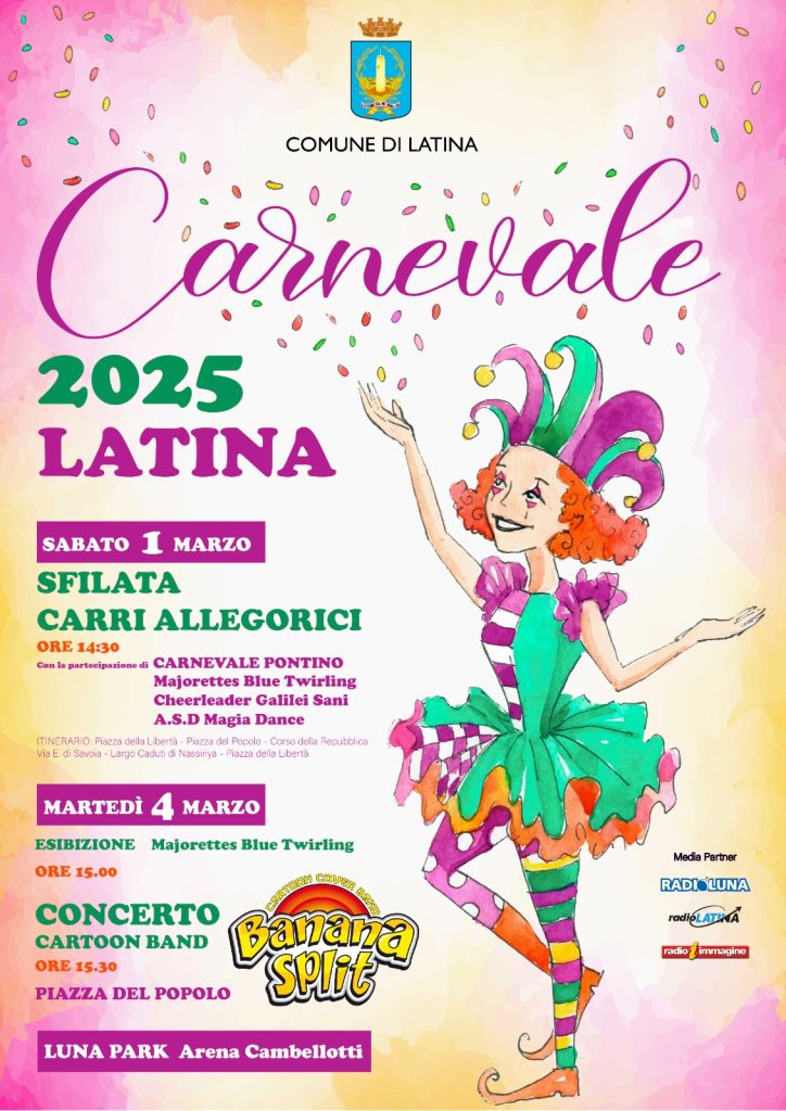 Sabato 1° marzo 2025 Latina, dopo cinque anni, si vestirà nuovamente a festa per il Carnevale con la sfilata dei carri. L’appuntamento è dalle 14.30 in piazza del Popolo con la sfilata di dieci carri allegorici realizzati dall’associazione Amici in Festa. Prevista anche animazione con lo spettacolo delle “Majorettes Blue Twirling” e delle “Cheerleader Galilei Sani”.