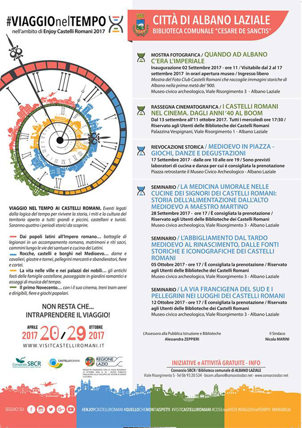 La manifestazione, a cura della biblioteca comunale “Cesare De Sanctis” di Albano Laziale, è inserita all’interno del cartellone dell’iniziativa “Viaggio nel Tempo” promossa dal Consorzio Sistema Bibliotecario dei Castelli Romani e finanziata dalla Regione Lazio.