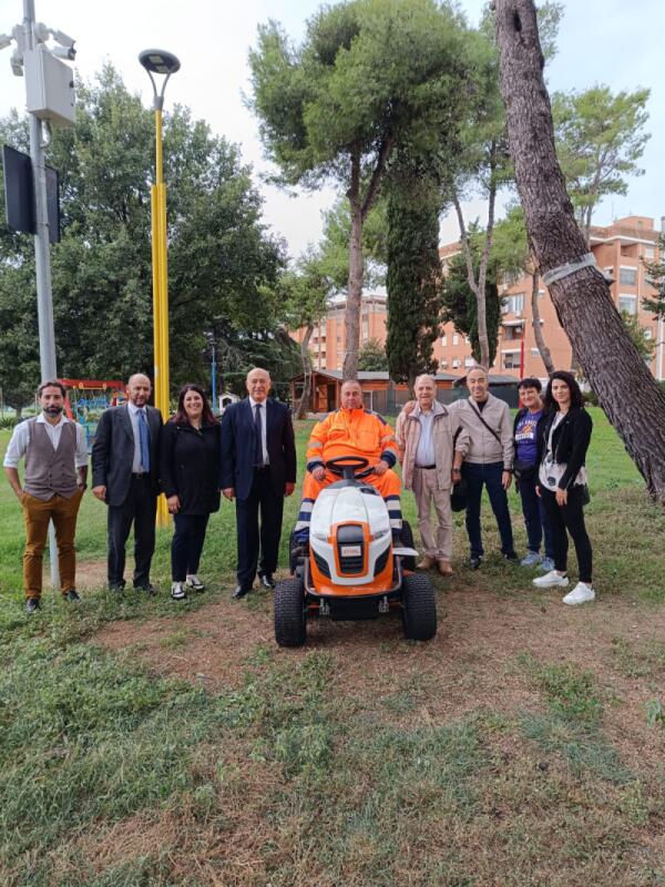 Aprilia - I volontari curano il verde e il commissario gli consegna un tagliaerba