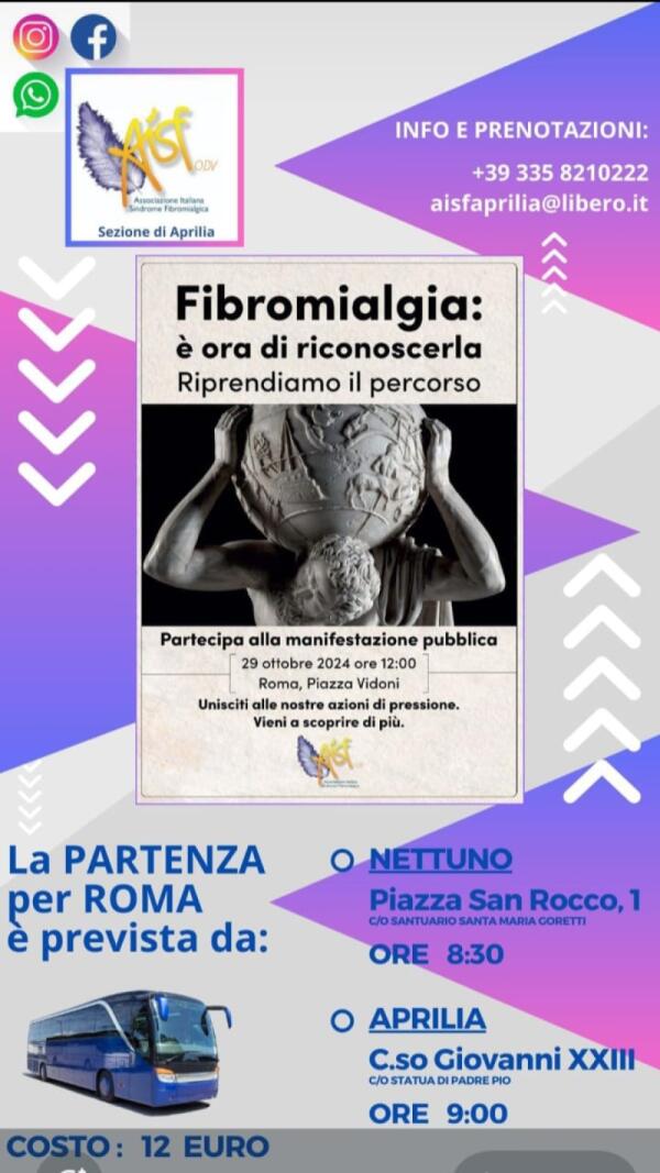 “Fibromialgia, è ora di riconoscerla” l’Aisf di Aprilia organizza la partenza in pullman per la manifestazione del 29 Ottobre a Roma.