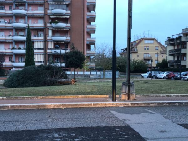 Crollo di alberi e rami pericolanti ieri per il forte vento: un albero, ad Aprilia, si abbatte sul prato del parco via Gramsci.