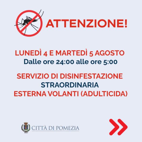 Aprilia, la disinfestazione antilarvale riprende in orario diurno da lunedì 4 a mercoledì 6 agosto.