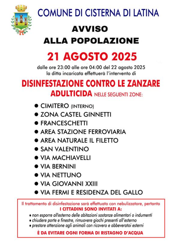 West Nile a Cisterna, nuovo intervento di disinfestazione nella notte tra il 21 e il 22 agosto