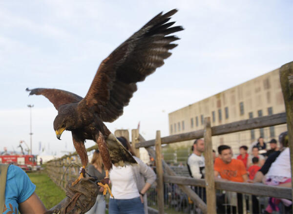 I “Falconieri romani” in azione ad Aprilia per allontanare gli storni dal centro città. Dopo i dissuasori, ieri i primi falchi in volo.