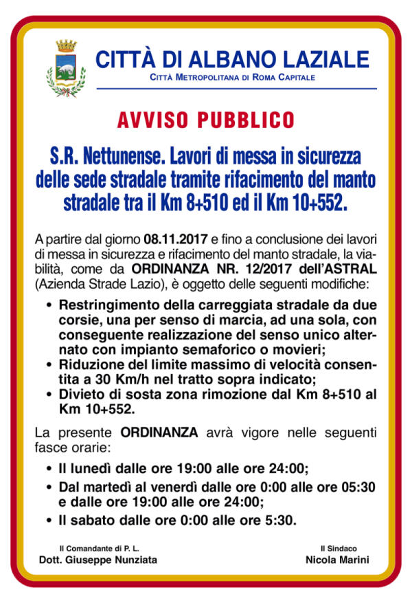 Dal prossimo 8 novembre lavori dell’Astral sulla Nettunense: ecco le modifiche alla viabilità.