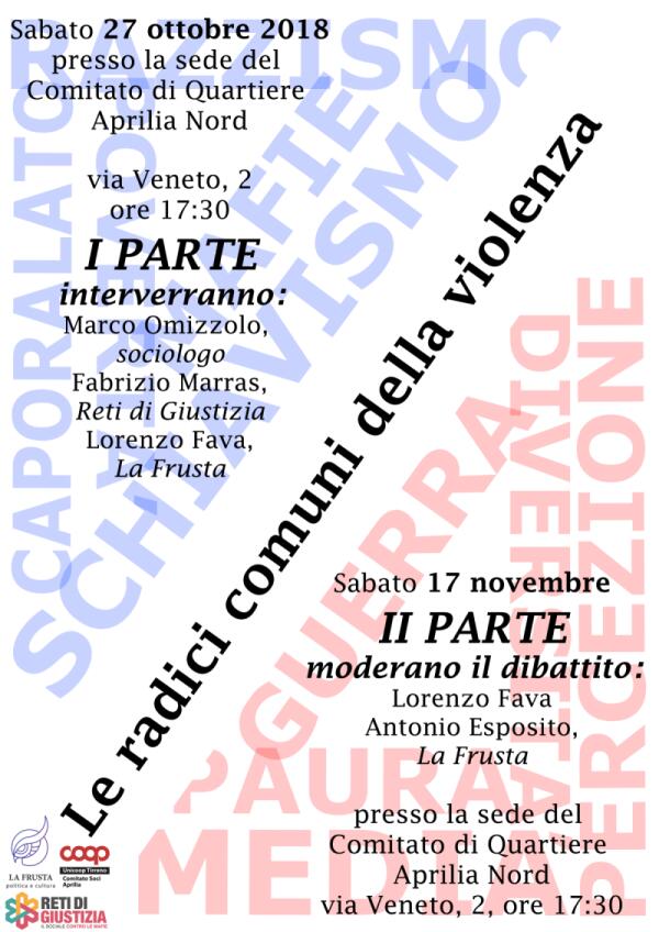 “Le radici comuni della violenza”: incontro pubblico sabato 27 ottobre ad Aprilia.