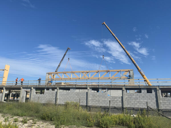 Nuovo palazzetto dello sport ad Aprilia: posizionata la trave portante in legno. Il 26 ottobre un seminario di studio con visita al cantiere.