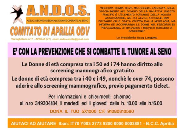 L'Andos di Aprilia promuove la promozione contro il tumore al seno: screening gratuiti per le donne dai 50 ai 74 anni