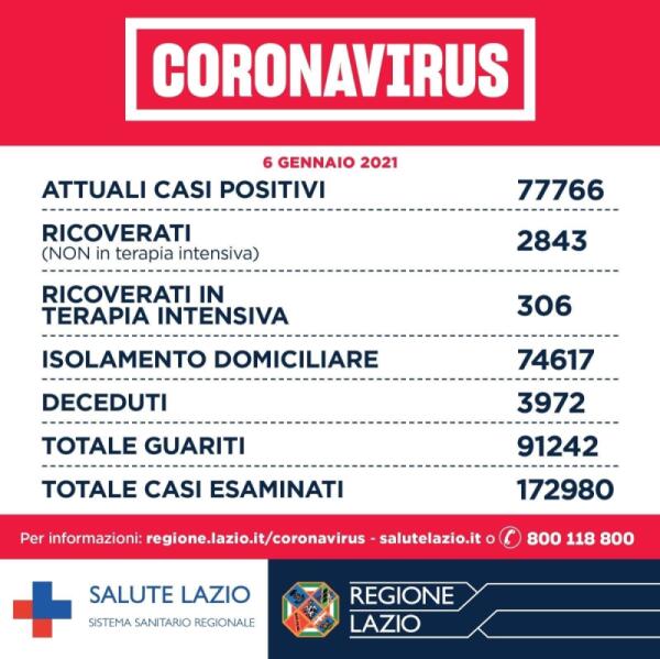 Covid, 2.007 casi positivi e 37 decessi nel giorno dell’Epifania nel Lazio. 207 casi nella Asl Roma6 5 morti.