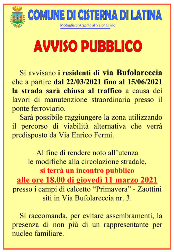 Lavori in via Bufolareccia, a Cisterna: il Comune organizza un incontro, questo giovedì, con la cittadinanza.