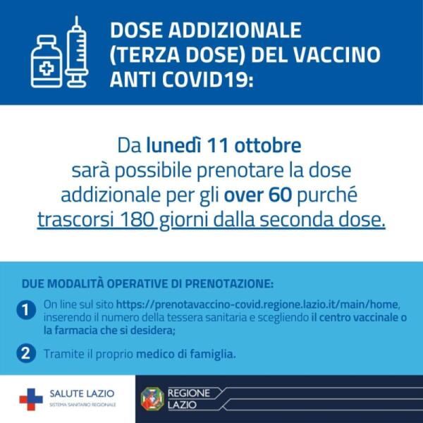 Contagi da Coronavirus nel Lazio: 230 nuovi casi positivi e 3 decessi. Da questo lunedì terza dose per gli over60 vaccinati da più di 180 giorni.