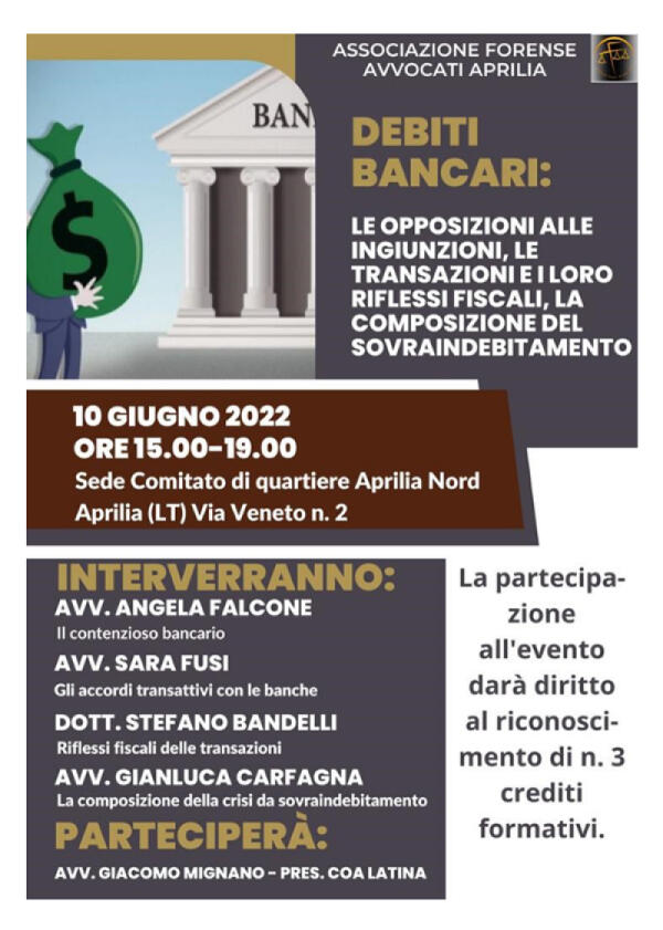Venerdì 10 Giugno un convegno dell’Associazione Forense Avvocati Aprilia sul tema del contenzioso bancario.