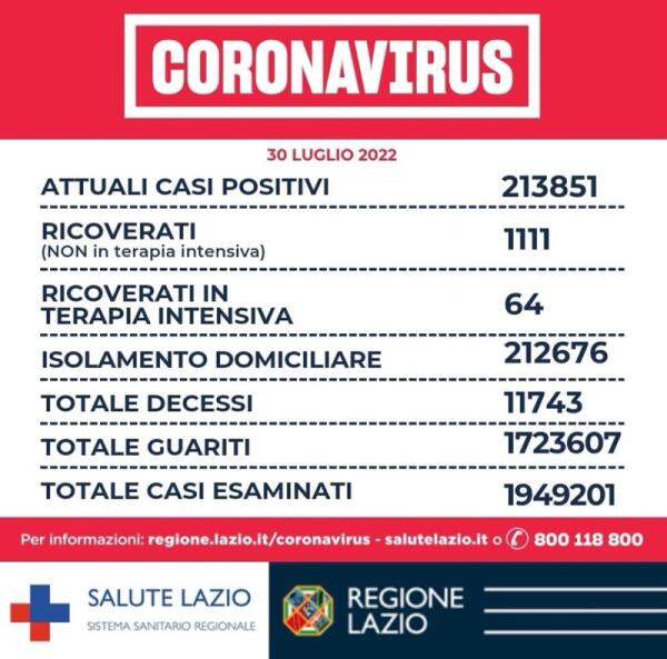 Contagi Covid nel Lazio: 3.842 nuovi casi positivi ed 8 decessi.
