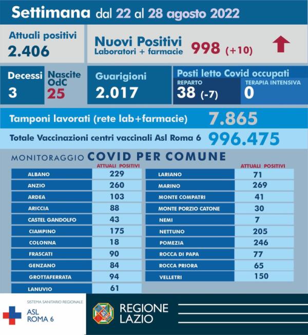 Covid, il bollettino settimanale della Asl Roma6: sono2.406 gli attuali positivi, 998 casi nell’ultima settimana.