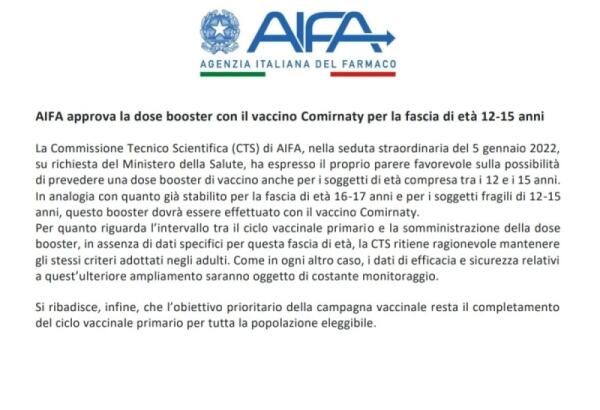 L’Aifa, l’Agenzia Italiana del Farmaco approva la dose booster, con il vaccino Pfizer, per la fascia d'età 12-15 anni.