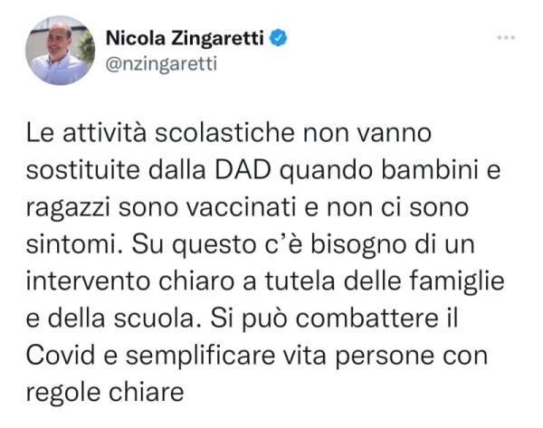 Zingaretti: “con vaccino e senza sintomi le attività scolastiche non vanno sostituite dalla Dad”.