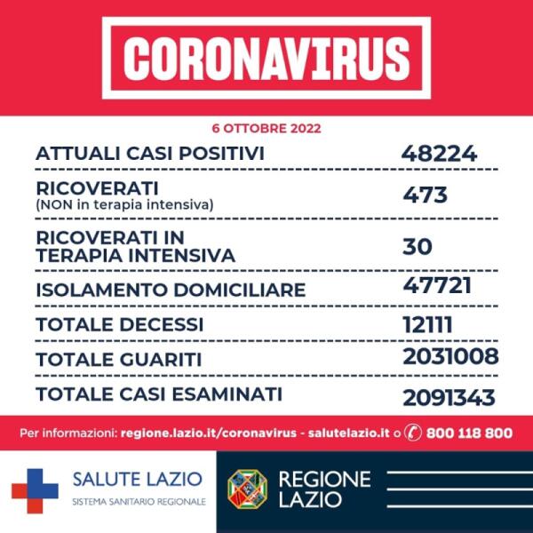 Bollettino Covid Lazio - 5 decessi di cui uno nella Asl Roma 6
