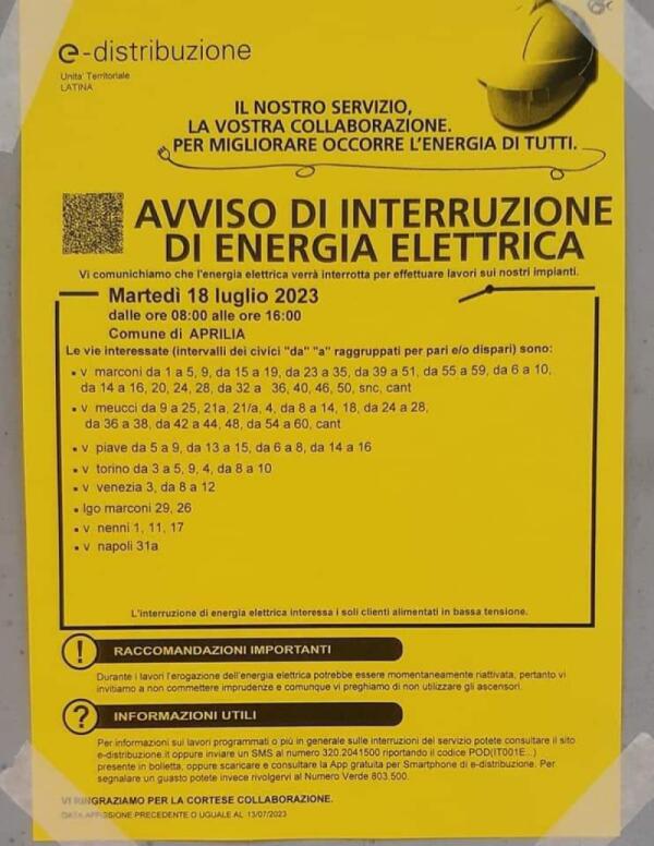 Il martedì nero di Aprilia. In alcune zone mancherà anche l'energia elettrica