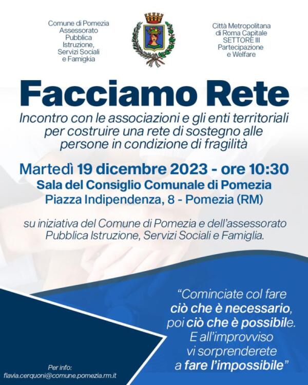 “Facciamo rete”: a Pomezia il 19 Dicembre un incontro con le associazioni e le reti territoriali.