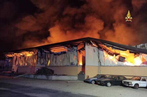 Capannone distrutto dalle fiamme la notte scorsa in via di Valle Caia, a Pomezia.