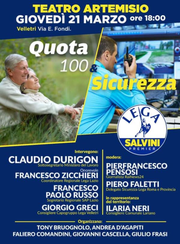 “Sicurezza” e “Quota 100”: al Teatro Artemisio di Velletri un incontro promosso dalla Lega.