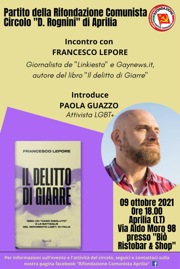 Rivendicazioni Lgbt+ nel nostro Paese: Rifondazione Comunista Aprilia propone la presentazione del libro "Il Delitto di Giarre” di Francesco Lepore.