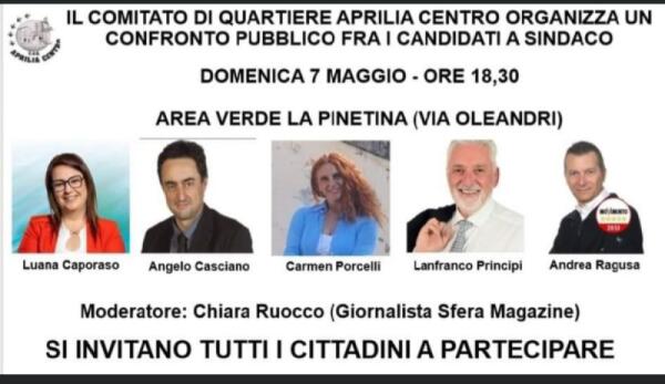 Confronto pubblico al Parco La Pinetina di Aprilia questa domenica tra i cinque candidati sindaci.