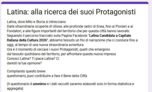 Da oggi si può partecipare al sondaggio online per Latina candidata a Capitale italiana della Cultura 2026. Possono compilare il modulo anche i non residenti