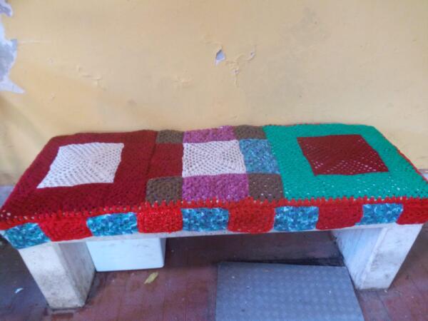 Le artigiane del mercatino natalizio abbelliscono le panchine del Mercato Coperto di Aprilia.