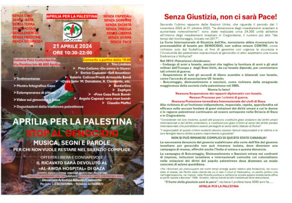 “Aprilia per la Palestina”: domenica 21 aprile la manifestazione organizzata da Aprilia Libera.