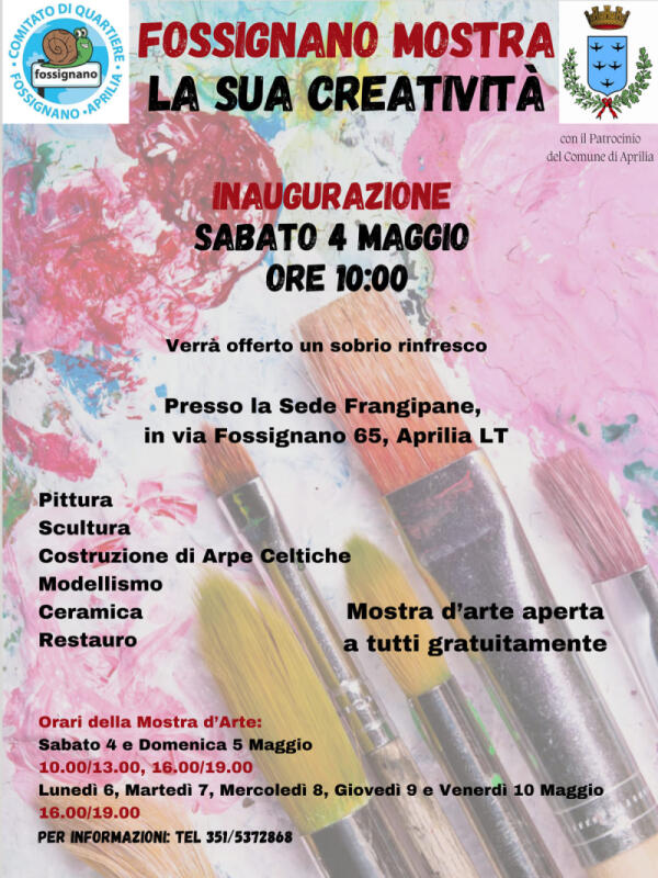 APRILIA - “Fossignano Mostra la sua Creatività”: sabato 4 Maggio l’inaugurazione dell’evento a cura del Comitato di Quartiere.