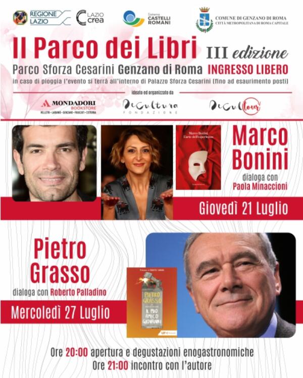 A Genzano torna la rassegna “Il Parco dei Libri”: ospiti Marco Bonini, Paola Minaccioni e Pietro Grasso.