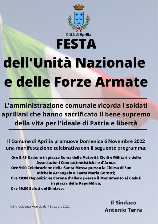 Festa dell’Unità Nazionale e delle Forze Armate: questa domenica 6 Novembre ad Aprilia la cerimonia.