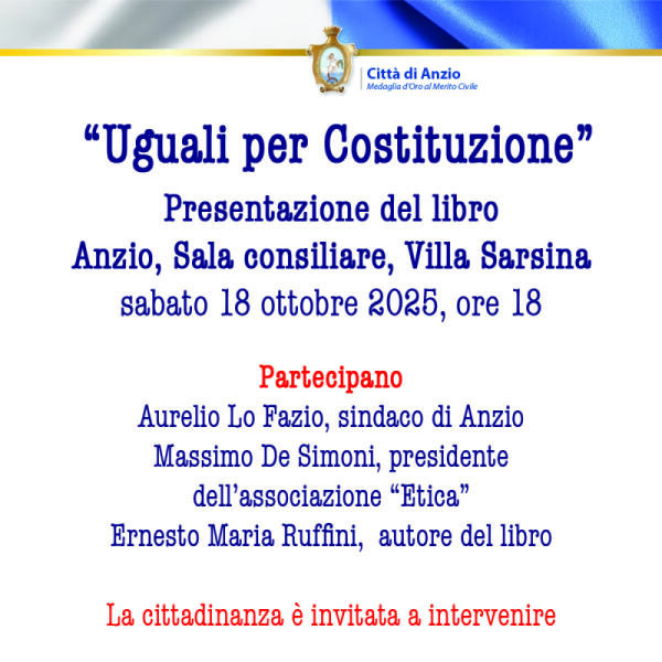 “Uguali per Costituzione”, oggi ad Anzio l’incontro con il professor Ernesto Maria Ruffini.