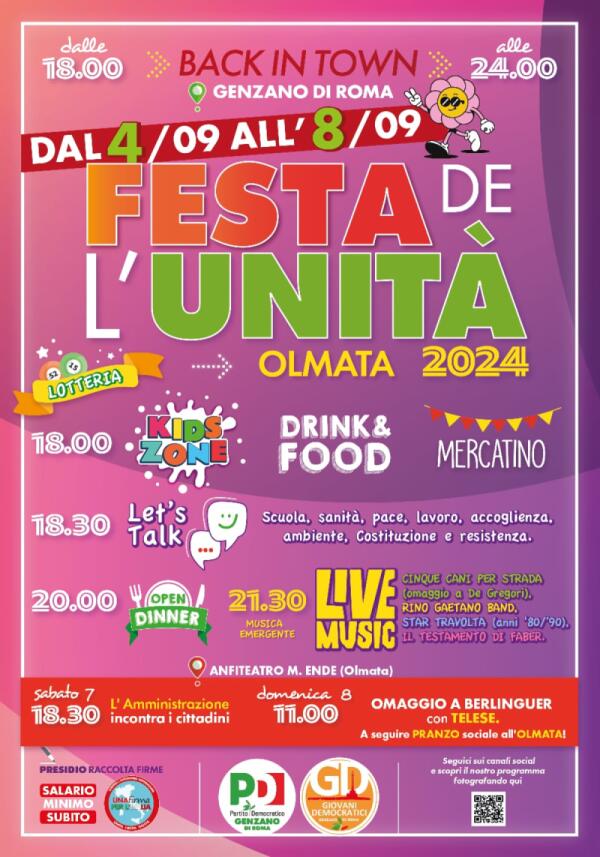 Festa de L’Unità a Genzano da mercoledì 4 a domenica 8 settembre